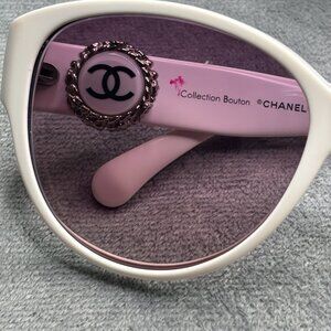 Stylish and iconic Chanel sunglasses with elegant white frames and signature button details on the arms.