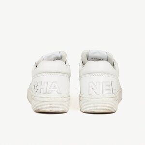 These sneakers from Chanel are crafted in a white leather, and feature closed rounded toes, perforated detailing, front lace-up closures, logos on the counters, leather lining and insoles, and tonal rubber outsoles.