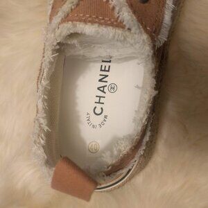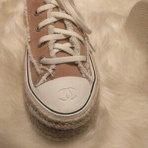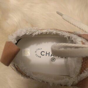 Step out in style with these Chanel women's sneakers. Featuring a chic light pink canvas design, these shoes offer both comfort and elegance. Sold to me as NWOT and I wore them once. Comfortable and stylish. Perfect for casual outings.