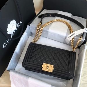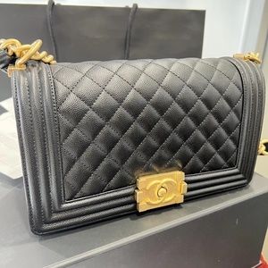 9.9/10 LIKE NEW Black Chanel Boy Medium in caviar leather and ruthemium hardware. Purchased from Holt Renfrew in 2020 but only used a few times, mostly has been sitting in dustbag. No sign of wear on exterior or interior. Protective sticker on inside. This retails for $8000 for now,and is a rare find.