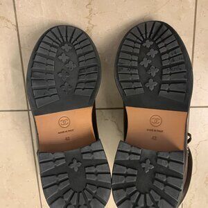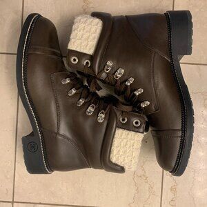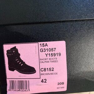 Chanel men's brown calfskin leather and beige tweed combat boots. Size 42 EU