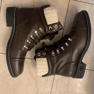 Chanel men's brown calfskin leather and beige tweed combat boots with silver grommets and logo detail on the heel. Size 42 EU. Condition: NWT, never worn. Rare. Collector's item. Purchased at Chanel Holt Renfrew Bloor.
