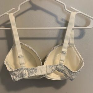 This is a beautiful and elegant lightly lined bra from the brand "CHANGE Lingerie." It features a soft, subtle blue and white floral print over a textured white fabric, creating a feminine and sophisticated look. The bra has light padding for a smooth and natural shape, and the straps are adorned with small bows at the base.