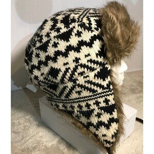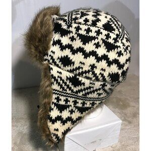 Chaos Trapper Hat Faux Fur Lined Knit Ear Flaps Tie Strings One Size Black White