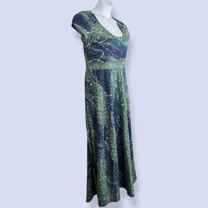 This dress by Chaps is made of 100% cotton and features a blue and green foliage pattern. The dress has short sleeves and a wide, round neckline. The waist is defined by a horizontal seam between the torso and skirt sections. The skirt section is long and flowy, with the hem falling around the ankles. The dress itself is lightweight and quite casual - pic 4 shows a closeup of the fabric. There is normal wear, but no issues affecting wearability.