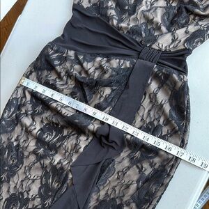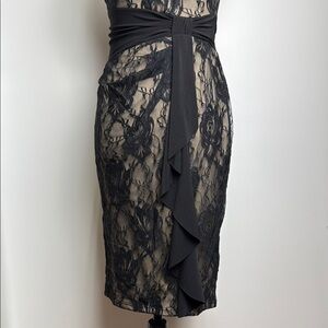 This elegant Chaps dress showcases a ruched design in a classic sheath silhouette, ideal for cocktail events. The black lace overlay and tan lining, combined with cascading front ruffles, a crew neck and cap sleeves, exudes sophistication. Its midi length and flattering draping ensure a timeless and romantic appeal for any formal occasion.
