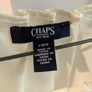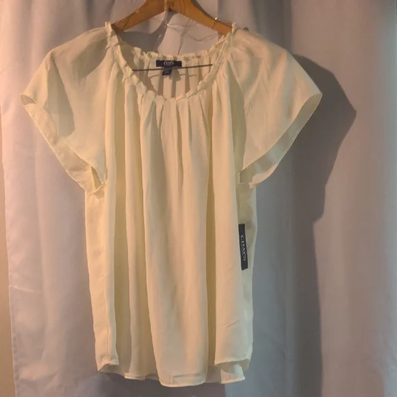 This Chaps cream blouse features a relaxed fit and is made from a light, sheer fabric. With its cap sleeves and delicate ruffled details, the top offers a blend of style and comfort. New with tags.