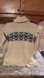 Chic Chaps sweater with a cream base and bold blue geometric design. Features a cozy cowl neck and stylish accents.
