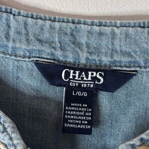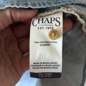 Casual light blue short sleeve denim shirt from Chaps. Features button-up front with ruffle detailing and a high-low design. Perfect for everyday wear.