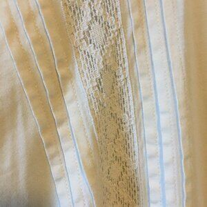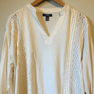 Very good preowned condition, off-white/cream flowy tunic blouse with pin-tuck details and embroidery accents by Chaps. Elegant, minimalist, sustainable elegant, throwback piece that is bound to elevate your wardrobe.