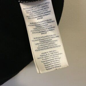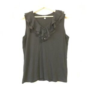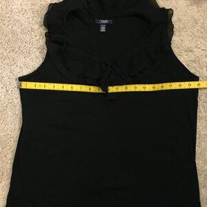 Very good preowned condition, black, sleeveless blouse with tie up at the collar and ruffles all the way around by Chaps. Tie up is weighed by silvery beads. All cotton, with exception to the trim/ruffles. High quality layering garment.