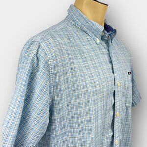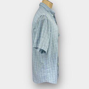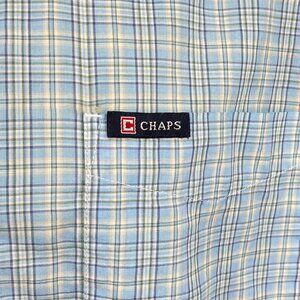This Chaps men’s short‑sleeve easy‑care button‑down shirt showcases a classic multi‑tone plaid in light blue, grey and cream with a neat button‑down collar, single chest patch pocket embroidered with the Chaps flag logo, pleated back yoke and a straight hem that hits at the hips for versatile styling. It’s tagged L/G but measures more like a 2XL (chest fits accordingly)