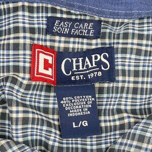 This Chaps men’s short‑sleeve easy‑care button‑down shirt showcases a classic multi‑tone plaid in light blue, grey and white with a neat button‑down collar, single chest patch pocket embroidered with the Chaps flag logo, pleated back yoke and a straight hem that hits at the hips for versatile styling. It’s tagged L/G but measures more like a 2XL (chest fits accordingly)
