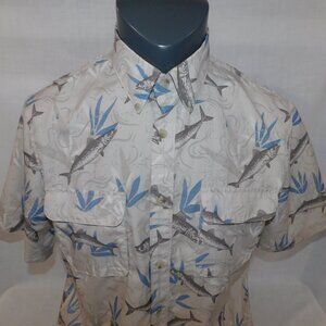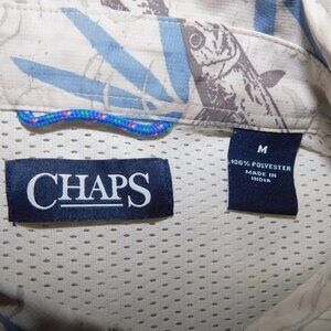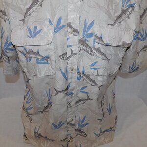 This Mens medium Chaps Salmon Fish Quick Dry Short sleeve button front shirt with UPF 50 Sun Protection is in Excellent clean bright condition. Shirt is 100% Polyester - machine washable. Shirt is moisture wicking and quick dry. Features two front self closing chest pockets. Perfect for a variety of outdoor activates from fishing and hiking to camping and travel.
