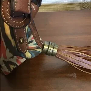 Chaps vibrant multicolor patterned fabric. secure front flap with ring hardware. Lightweight and versatile for everyday use. Coordinates well with casual and boho outfits.