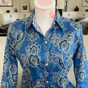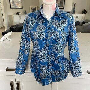 Chaps No Iron 3/4 Slv Button Down 100% Cotton Paisley Shirt Blue White Sz S