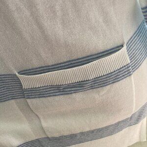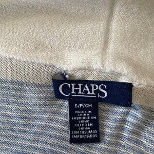 This Chaps cardigan is light weight and perfect for summer. It has patch pockets and is about 29 inches long. White with blue stripes. Open front, size Small