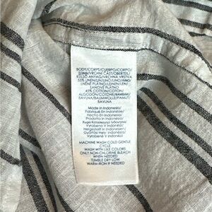 Relaxed fit, box-pleat at center back yoke, shirttail hem, front and sleeve plackets. Easy care and comfortable to wear. Like new. 55% Linen, 45% cotton.