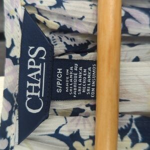 This Chaps blouse showcases a relaxed style with elegant ruffled bell sleeves in a 3/4 length. The cream and blue hues create a sophisticated look, perfect for a light and airy feel. Listed as Small but would easily fit a Medium.