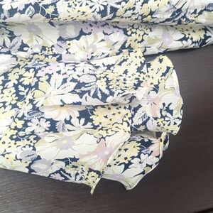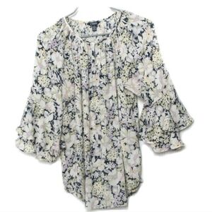 This Chaps blouse showcases a relaxed style with elegant ruffled bell sleeves in a 3/4 length. The cream and blue hues create a sophisticated look, perfect for a light and airy feel. Listed as Small but would easily fit a Medium.