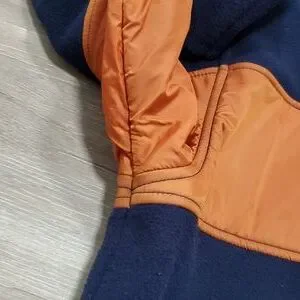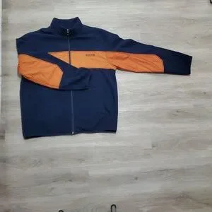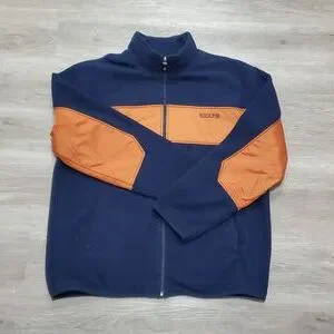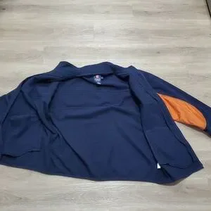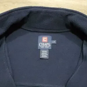 Chaps Spring Fall Jacket. Vibrant Color Schematics. Dark Blue & Dark Orange. Tag Says Large in Size, may Fit an XL Fittment. 💯% Polyester. The Dark Blue is Fuzzy Wuzzy like Fleece. Excellent Used Condition. No rips, tears, holes or stains. All Zippers Work like New.