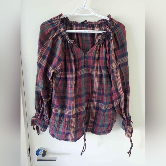 Chaps multicolored blouse, size S but could fit a M. Cinches at the waist, sleeves fall just below the elbow.