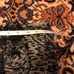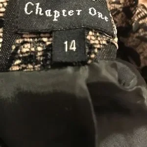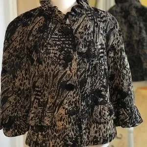 Dress up your look with brocade black and beige Chapter One jacket. The ruffled collar and sleeve cuffs add a touch of style to this jacket. From pit to pit measures 21” and from pit to hem 13”.