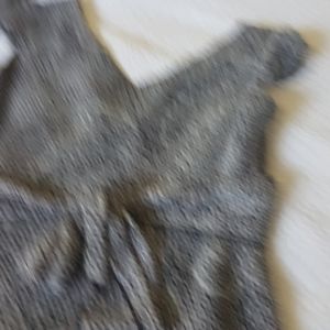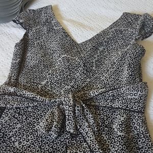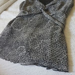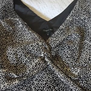 Chapter One too, cap sleeves, black and gray ring pattern. Light and airy chiffon overlay and ribbon that ties at the back. Size small. EUC