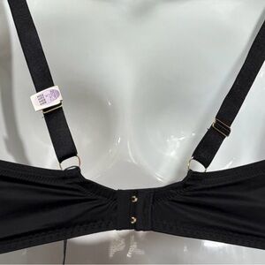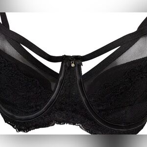 Elegant black bra with lace and mesh cups, featuring decorative straps across the bust.