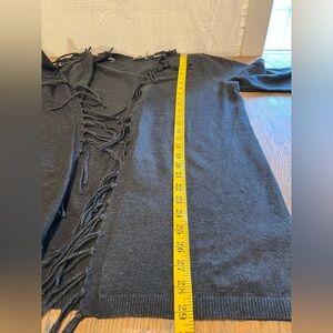 Never worn (NWOT) charcoal grey open-front cardigan with fun fringe trim along the edges. Features long sleeves and a soft, mid-weight knit made of polyester, acrylic, modal, and spandex blend. Comfortable and stylish layering piece that adds movement and a boho twist to any look.