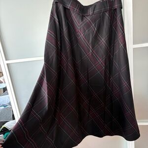 Dark grey, almst black with dark red (maroon) adnd whote plaid sa-line skirt with a fabric belt/ Stylish and comfortable, perfect for Fall and Winter. Size 14. Good condition.