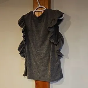 Step out in style with this elegant charcoal ruffle sleeve tee. Perfect for casual outings, it combines comfort with a touch of flair.
