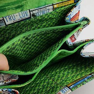 Excellent pre-owned condition, Charity's Stitches & Such women's large textile wallet with all over license plates print from various states tates with black faux leather foldover snap closure and green interior with multiple compartments including a secure zippered pocket fir essentials and coins.