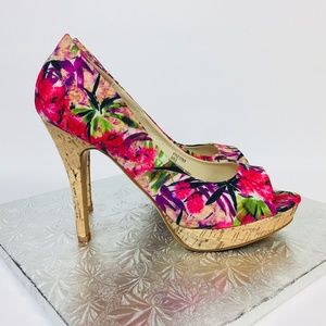 Faux cork platform, bright floral pattern, open toe heels. 5” heel, 1” platform. Only visible wear is on bottoms. See photos.