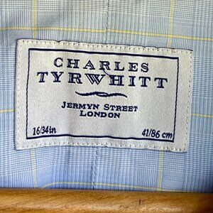 Charles Tyrwhitt light blue with faint yellow and white plaid pattern button down shirt, size 16/34 inches. Good used condition, cat friendly, nonsmoking home.