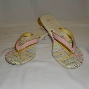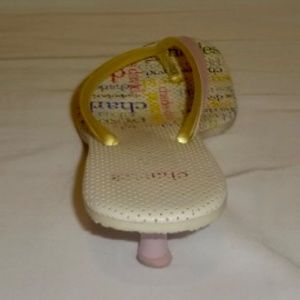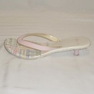 These fun sandals with a 1 1/4" heel are a definite conversation piece. Being they have a white under sole they are dirty on the bottom, but in great condition otherwise. Sandals will be shipped in original box.