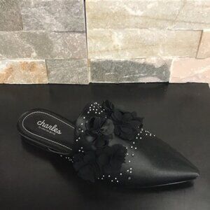Tiny crystals and studs pepper the pointed toe of a chic satin mule finished with 3D flowers.