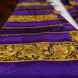 Elevate your style with a touch of luxury with this Charleston Purple, Gold, and Black Paisley and Geometric Silk Tie. Featuring an exquisite blend of paisley and geometric patterns, this tie is adorned with rich hues of purple, gold, and black, creating a bold and sophisticated look. The intricate design elements and vibrant color palette make this tie a standout accessory for any formal or special occasion.