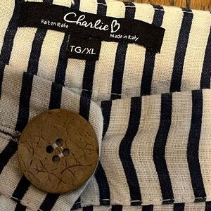 Jupe rayée bleu marine et blanche signée Charlie B, fabriquée en Italie. Coupe évasée flatteuse, boutons décoratifs effet bois sur le devant et ceinture élastique à l’arrière pour un confort optimal.