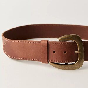 This sleek belt is a timeless accessory essential, featuring an oversized frame buckle and smooth leather fabrication for a chic look. Color is Cognac. Size M/L.