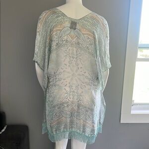 Stylish sheer kimono in mint. Features fringe accents. Ideal for layering. 82 cm pit to pit, 101 cm length