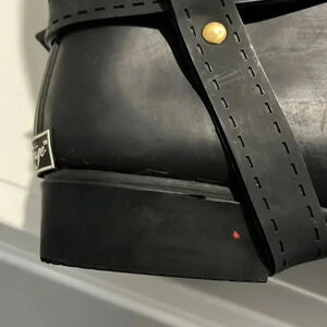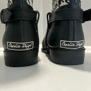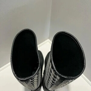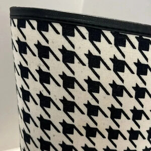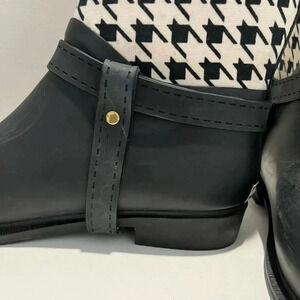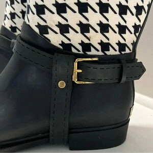 Slip on style. Waterproof. Black & cream fabric houndstooth pattern. Black rubber base. Leather trim around top. Soft lining. Gold buckles on side.