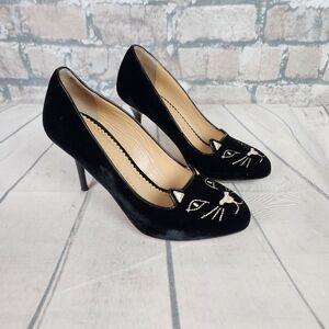 Charlotte Olympia Kitty Cat Embroidered Velvet Pump Black Gold Size 36/6