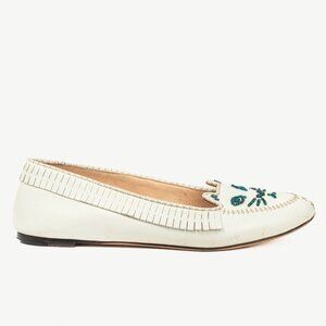Charlotte Olympia Kitty White Leather Beaded Fringe Flats