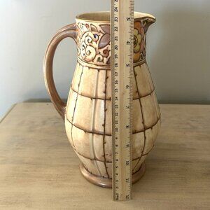 Features: The jug showcases a cream base with a trellis pattern, decorated with stylized flowers and leaves in orange and brown.