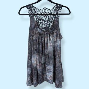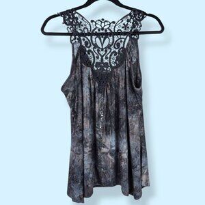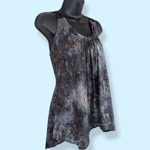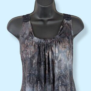 This sleeveless top by Charlotte Russe is made of a polyester/spandex blend (92/8) and has a beautiful dark, abstract pattern. The top has medium-width straps with a black lace back, a round pleated neckline, a flared, flowy bottom, and a trail of glittery sparkles along the spine. The fabric has a metallic quality to it and changes slightly in the light. It's also soft enough that it tricks my brain into thinking it's velvety or slightly fuzzy somehow. There are no issues that affect wearability.