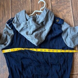 Navy and gray hooded jacket by Charlotte Russe. Features zipper and button details.