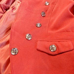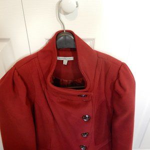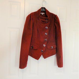 This fitted jacket features a soft wool and polyester material, front button up closure and mock neckline. Includes 7 buttons in front with 2 more at the front pockets and are shiny gray. Puff Sleeve and fold over collar as per pictures.
