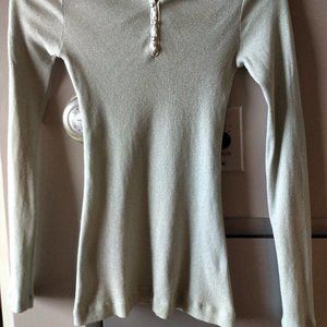 it is long and soft. with a metallic thread. the green is soft. Beautiful buttons accessorize in the front - more for show - not to button up.