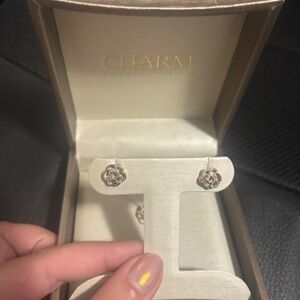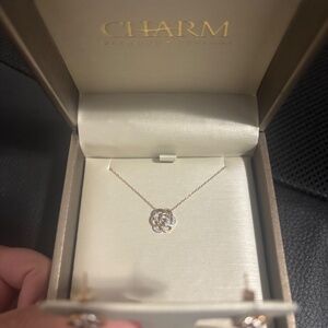 Earrings are rose-shaped studs with sparkling diamond details. Necklace has a matching pendant on a delicate chain, with a diamond-accented rose motif.